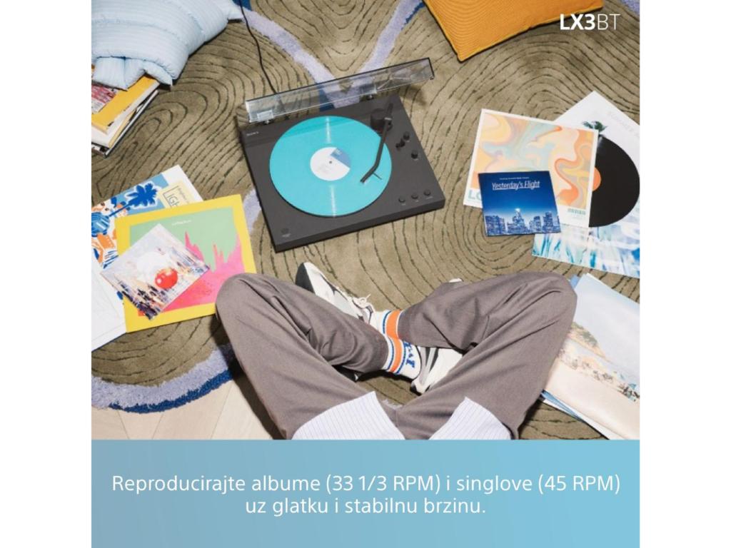 Sony Gramofon PSLX3BT; Bluetooth1 povezivanje uz aptX Adaptive i zvukom Hi-Res Wireless; automatsko pokretanje gramofona remenastim pogonom s dvije brzine: 33-1/3, 45 ok./min; Samo jedan gumb za potpuno automatski rad