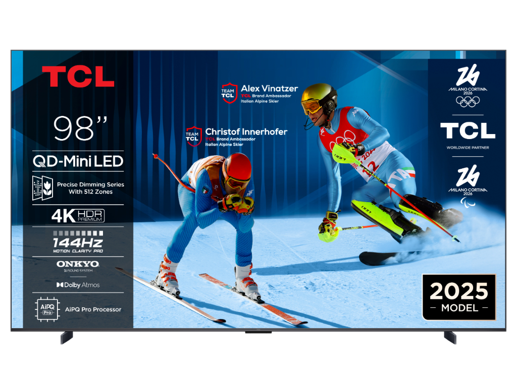 TCL 98"C6K 4K QD-Mini LED TV; 144Hz native display; Matte HVA Panel; Google TV; Game Master; Dolby Atmos; Onkyo 2.1; HDR Premium; HDR10+ HDR10 HLG; Netflix Youtube Amazon Prime Apple TV; Chromecast & T-cast; HDMI: 4x 2.1; USB: 1x 3.0;